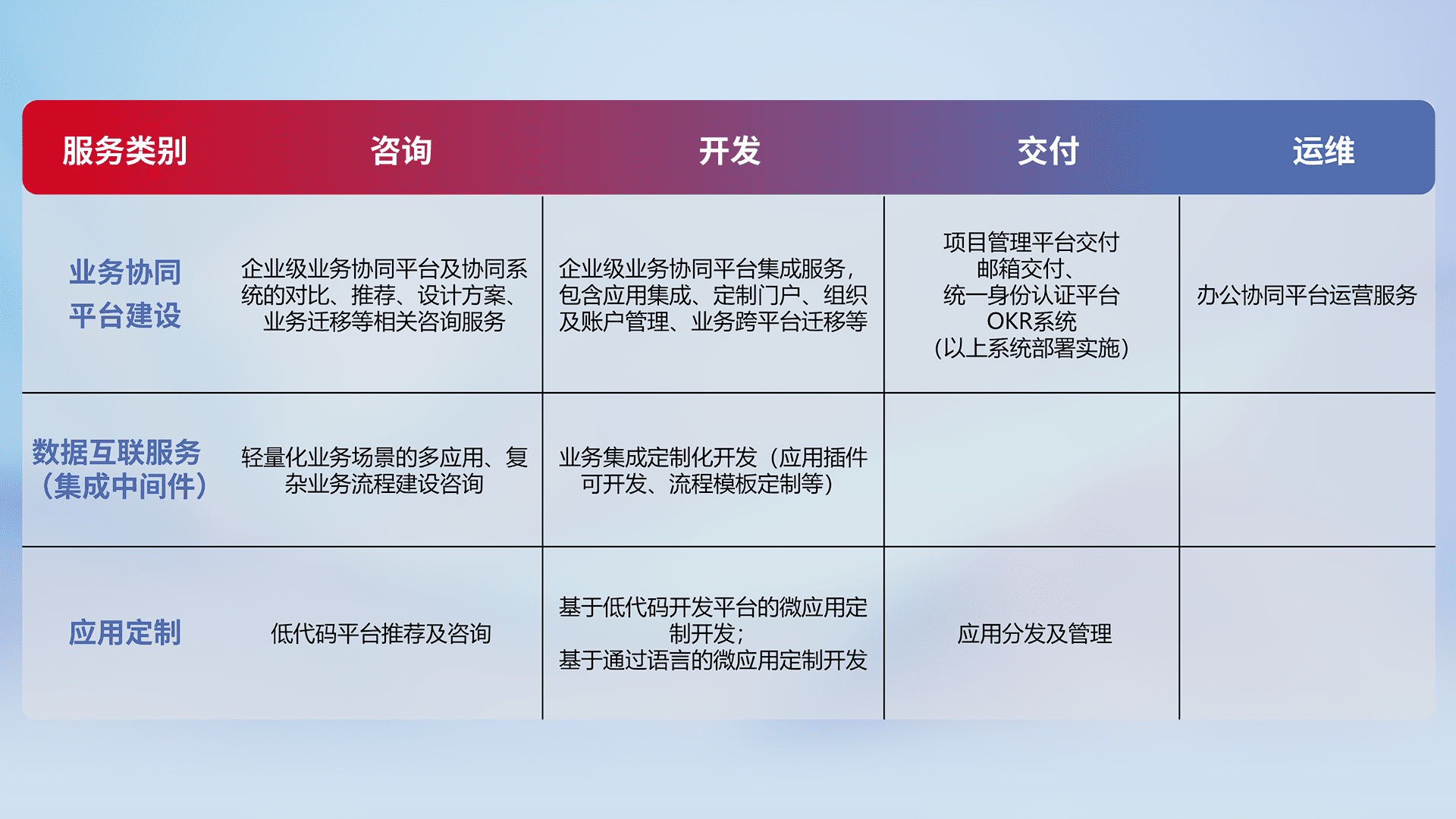 针对钉钉、、、企微、、IDaas等平台级产品提供产品的规划、、方案、、、、交付、、、、定制化开发等服务,,,实现如统一协同办公、、、、智能客户服务、、、混合会议管理、、智能数据查询、、、等业务场景,,,实现数字化转型。。。